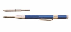 Slim design for better visibility. Pushing down on body releases striking mechanism, which can be adjusted for light or heavy strokes. Removable centring point can be interchanged with cup-shaped riveting point. Pocket clip included.