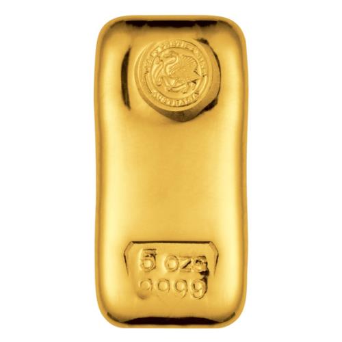 Perth Mint gold bullion bars are cast from 99.99% pure gold. Gold Content: 5 Troy oz Minimum Weight: 155.56g Purity: 99.99% Dimensions: 39mm x 19mm x 13mm