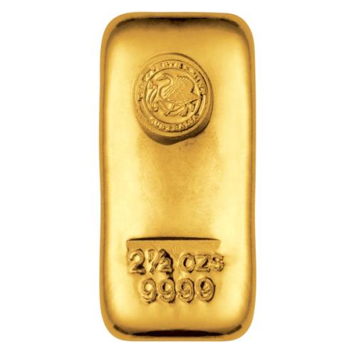 Perth Mint gold bullion bars are cast from 99.99% pure gold. Gold Content: 2.5 Troy oz Minimum Weight: 77.87g Purity: 99.99% Dimensions: 35mm x 17mm x 8mm