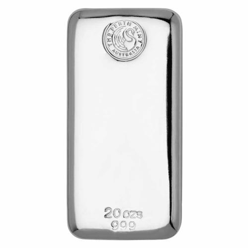 Perth Mint 20oz Fine Silver Cast Ingot Silver Content: 20 Troy oz Minimum Weight: 623.00g Purity: 99.9% Dimensions: 85mm x 42mm x 18mm