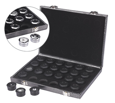 Holds 24 individual supplied plastic tins. Tins feature reversible inserts - white or black. Silver coloured metallic finish. 25mm diameter, 20mm window. Case features hinged lid with catches. Case measures 235 x 167 x 30 mm excluding catches.
