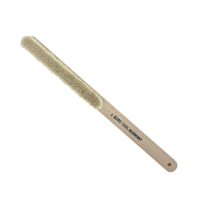 This white bristle brush locked in a wooden handle is used for cleaning benches of swarf or lemel, and other washing applications. Length: 220mm Firmness: #4