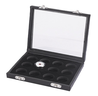 Tins are 29mm diameter, 24mm window. Metallic finish with reversible insert for black or white background. Case is 180 x 140 x 28mm excluding catches. Hinged glass insert lid with 2 catches.