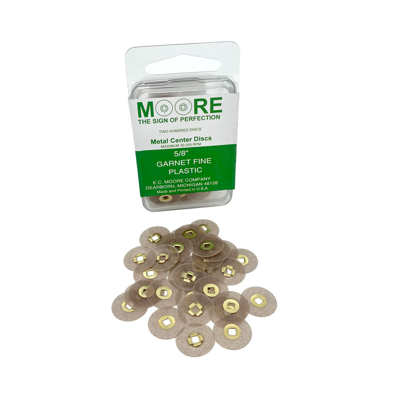 Moore's Sanding Disks are abrasive discs with a press-on/flip-off square centre hole. Exclusive grit and backing are designed for dental finishing and jewellery applications and provide exceptionally long life. Highly convenient compared to other Mounted on thin backing, the Moores disks provide outstanding results for sanding and smoothing operations. the flexible backing allows accessibility to hard-to get-at areas. Used with 3/32" mandrel, Regal code MA330. Sold as a pack of 200 discs Material: Garnet Disc Type: Plastic Diameter: 5/8" Grade: Fine
