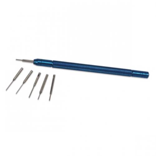 This upgraded pin removing tool is attractive aluminum with three long pins: .70 .80 and .90mm and three short pins: .70 .80 and .90mm diameter.