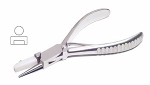 The flat jaw is nylon, so you won't scratch or mar the surface. The metal jaw is round, making these ideal for bending ring shanks and shaping earring wires. Use on sheet and wire to form intricate designs. Overall length 5-1/2".