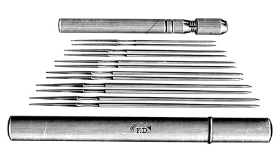 12 pieces 0.5 - 2mm assorted, five-edged, with metal handle, in plastic box