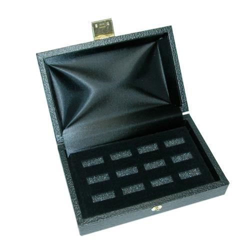 The items in this line include trays and cases for 12, 24, and 36 rings. Cases are wood, covered in textured black vinyl, with simply designed metal latches. Slotted black foam under the velvet inserts hold rings firmly in place.
