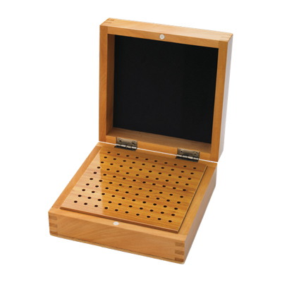 Wood box holds 100 burs with hinged lid and clasped closure.